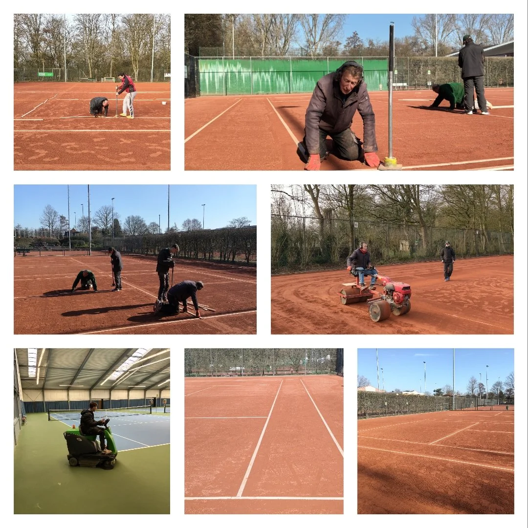 Een mooie mijlpaal in de voorbereiding van het nieuwe buitenseizoen. De banen beginnen er nu weer echt als tennisbanen uit te zien.